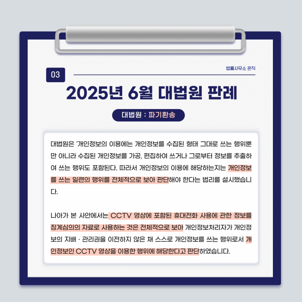 관련하여 바로 지난주(2025. 6. 26.) 대법원에서 어린이집 원장이 CCTV영상을 보고 보육교사의 휴대폰 사용내역을 확인인 후 보육사업 담당자에게 이 사실을 전달한 사안에서 개인정보보호법 위반을 인정하는 취지의 파기환송 판결을 한 사례가 있어 소개합니다.