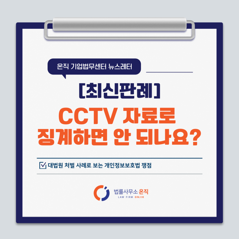 이렇듯 CCTV를 직원 근무관리나 징계자료로 활용하고 싶다면, CCTV 설치 단계부터 수집 목적, 처리근거를 명확히 확보해두는 게 좋습니다.