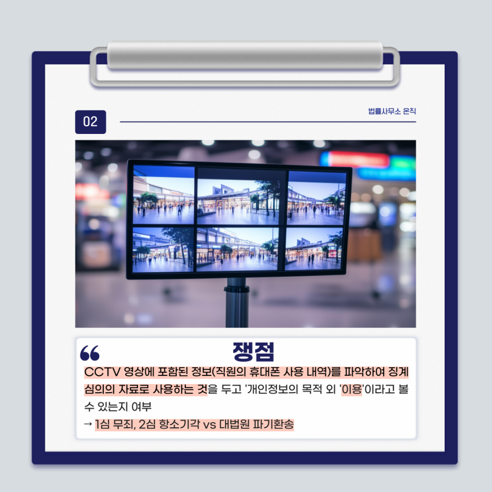 쟁점은 CCTV 영상에 포함된 정보(직원의 휴대폰 사용 내역)를 파악하여 징계심의의 자료로 사용하는 것을 두고 '개인정보의 목적 외 '이용'이라고 볼 수 있는지 여부 였습니다.